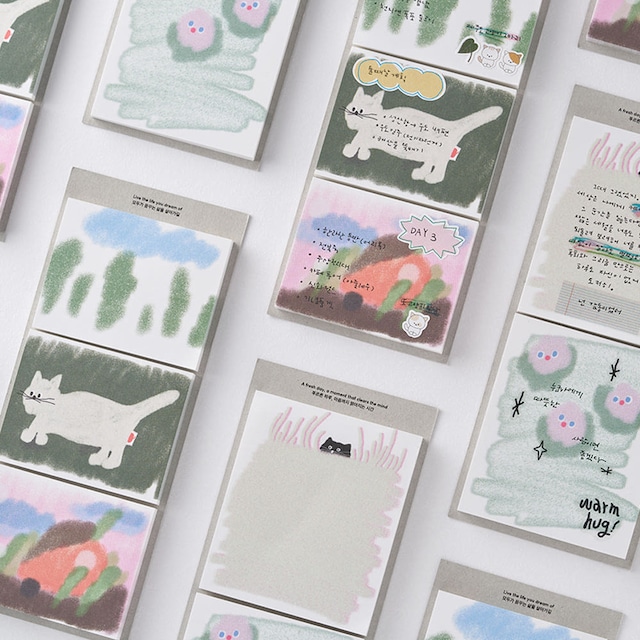[SHYMONSTER] Drawing Memo Pad どこかほっとする 居心地の良い絵 が添えられた、温かみのあるメモパッド。 文字を添えると自然に調和し、 たったひと言の記録さえも “ちょっと特別なメモ” に変えてくれます。 1枚のボードには、2〜3種類の非粘着メモ用紙がセットされており、 気分や用途に合わせて自由に使えるのが魅力。 落ち着いたデザインなので、PC・デスク・ノートなど どんな場所にもすっと馴染みます。 [サイズ] 80×190mm [枚数] 80枚 [タイプ] ・forest ・layered ・blue cat ・green cat
