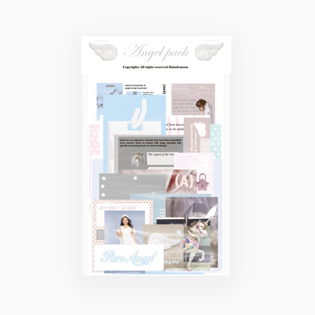 [Dain de moon] Angel pack 小さな天使たちがそっと微笑む、優しい雰囲気のステッカー&ペーパーの詰め合わせ。 羽ばたく羽根やキラリと光る星、ふんわり淡い色合いが、ページに特別な癒しをもたらします。 アンティークの絵本のような雰囲気で、ギフトラッピングにもぴったり。 ページに貼るだけで、ゆめかわ世界が一気に広がるデザインばかり。 コラージュや手帳デコがもっと自由に、もっと楽しくなるファンタジーアイテムです。 [内容] ペーパー:11枚 ステッカー:16枚 [サイズ] 商品画像をご参照ください。