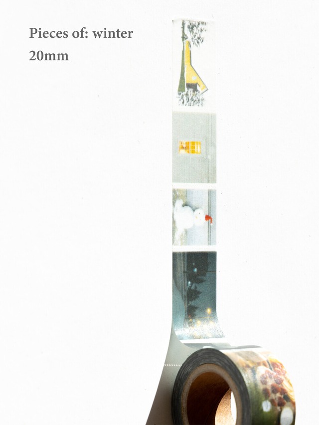 [SUJIPSEO] Pieces of: Winter 冬らしい情景を切り取った10個の“ウィンターピース”が繰り返される構成のマスキングテープです。 それぞれのピースには個別にカット加工が施されているため、 1つずつシールのように手軽に使えるのが魅力。 ページに貼るだけで、静かで澄んだ冬の空気がふわりと漂います。 使用されている写真は、 作家本人が直接撮影したものをもとに制作されています。 冬の瞬間を丁寧に集めた、特別感のある一本です。 [サイズ] 20mm × 1m