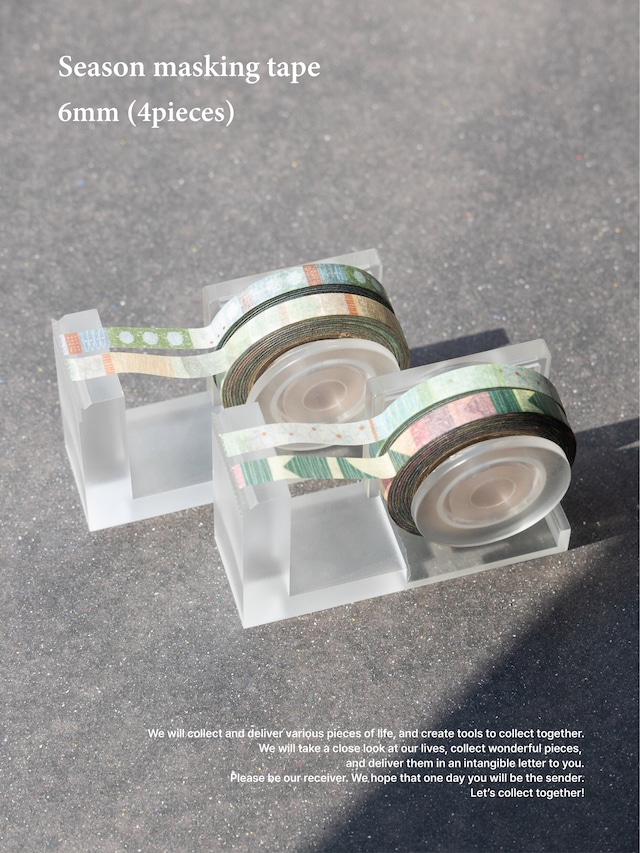 [SUJIPSEO] Season masking tape 春・夏・秋・冬。 日本の四季がみせる彩りを、小さなマスキングテープにぎゅっと詰め込みました。 季節ごとの空気感や色の移り変わりが、ページにそっと寄り添う4本セットです。 細めの6mm幅なので、手帳の隙間や見出し、コラージュのアクセントにも使いやすく、 日々の記録に自然な季節感を添えることができます。 [サイズ] 6mm × 10m [内容] 4デザインセット(春・夏・秋・冬)