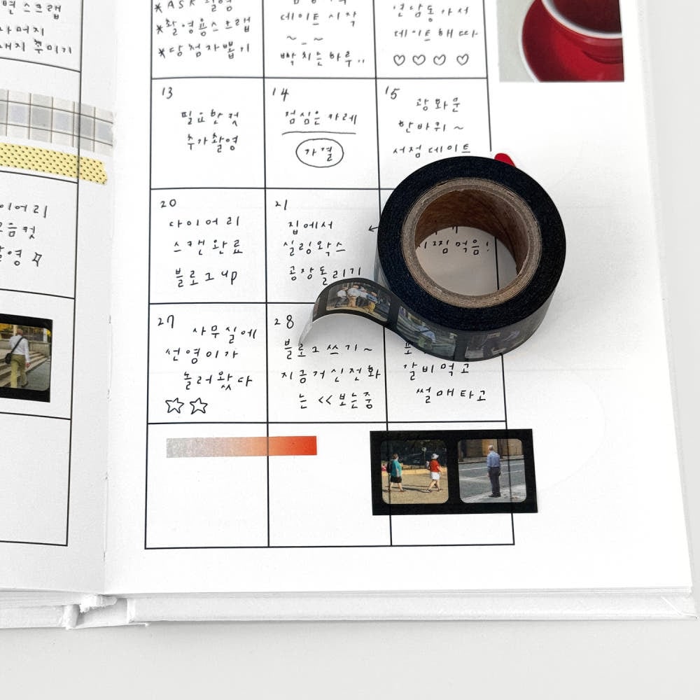 黒いフィルム枠がデザイン全体を引き締め、貼るだけでコラージュや手帳ページに物語性をプラス。
