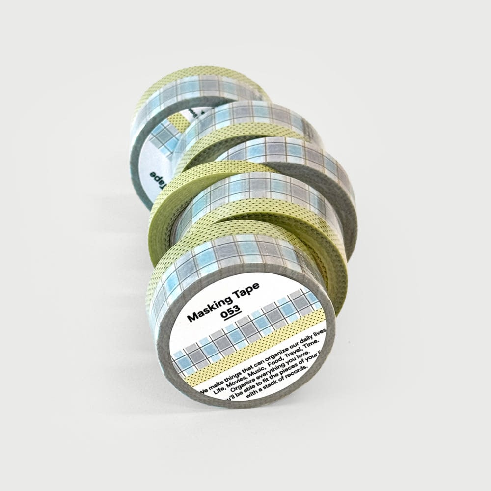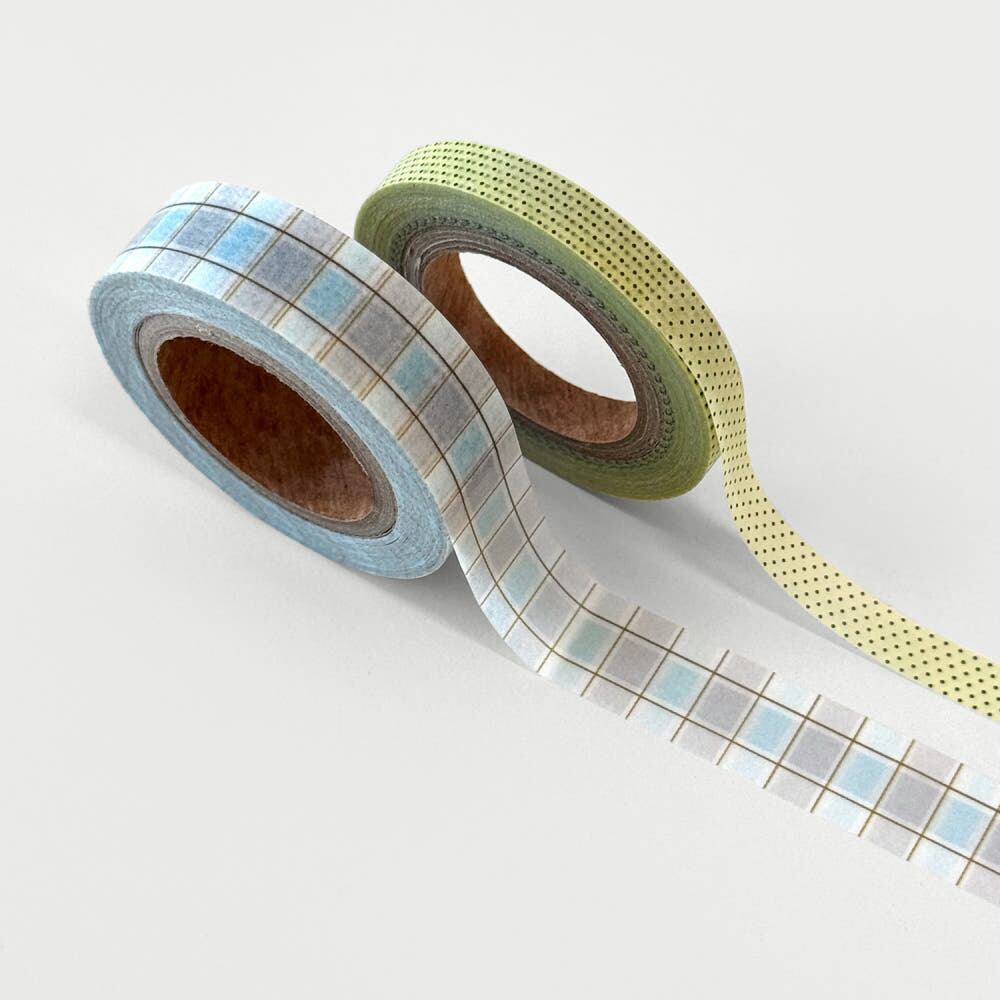 ブルーとブラウンのチェック柄と、黄色に小さな茶色のドット柄を組み合わせたマスキングテープセット。