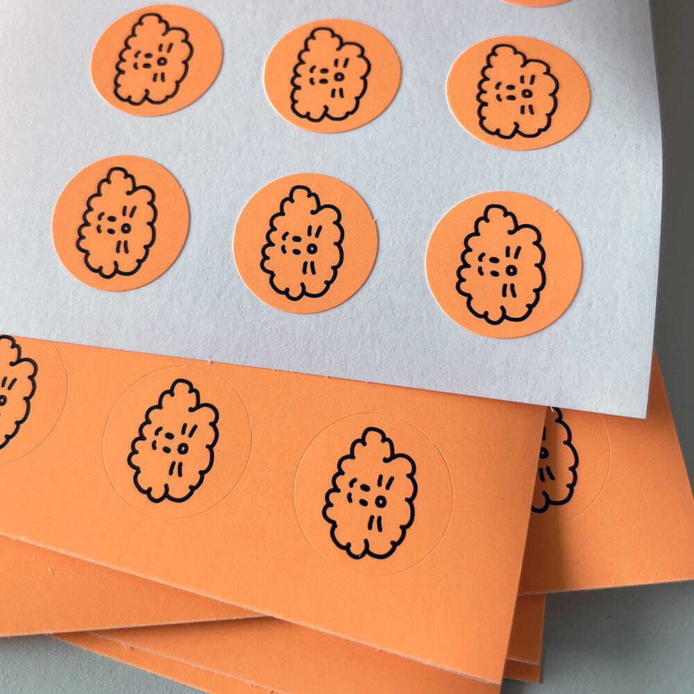 パッと目を引くオレンジ色の丸いシールに、愛らしい「リトル・チャーリー」をデザイン。