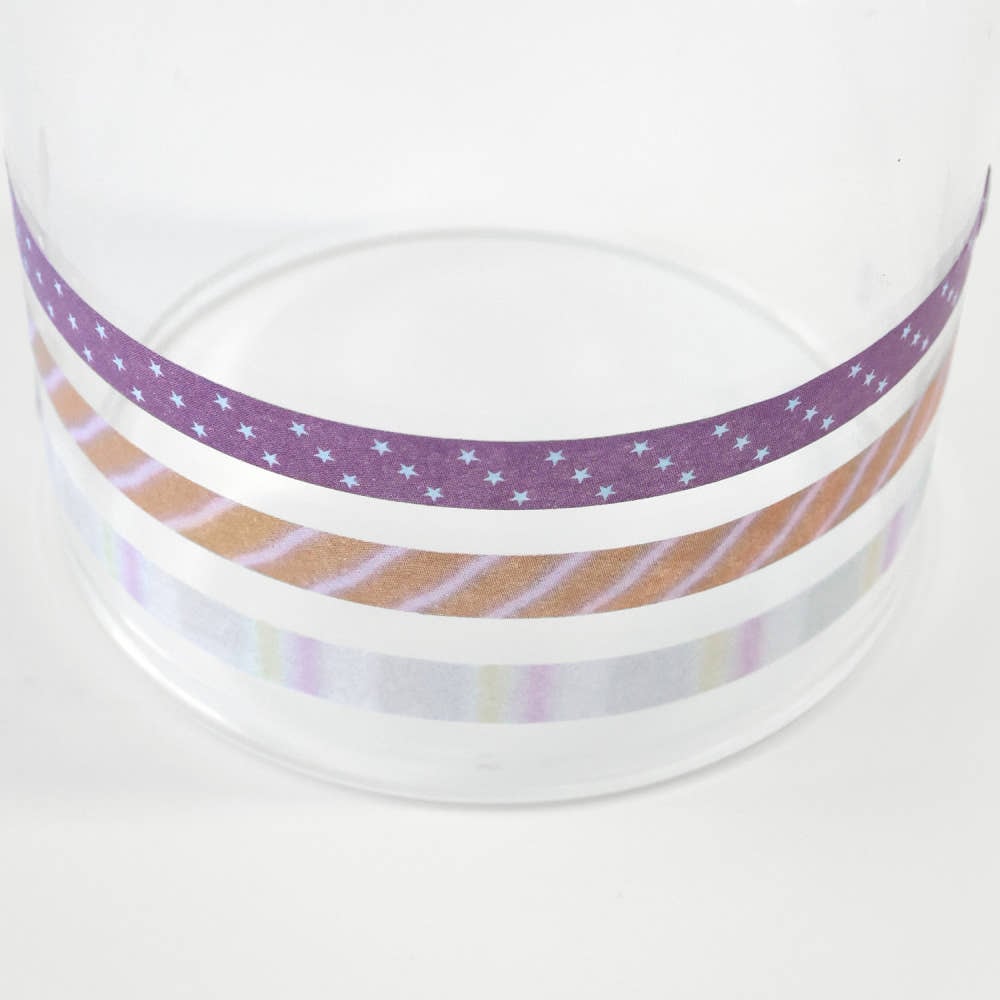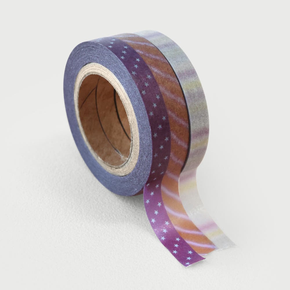 深みのあるパープルに散りばめられた星、ミルクティーのようなブラウンのストライプ、そして淡い虹色のグラデーション。