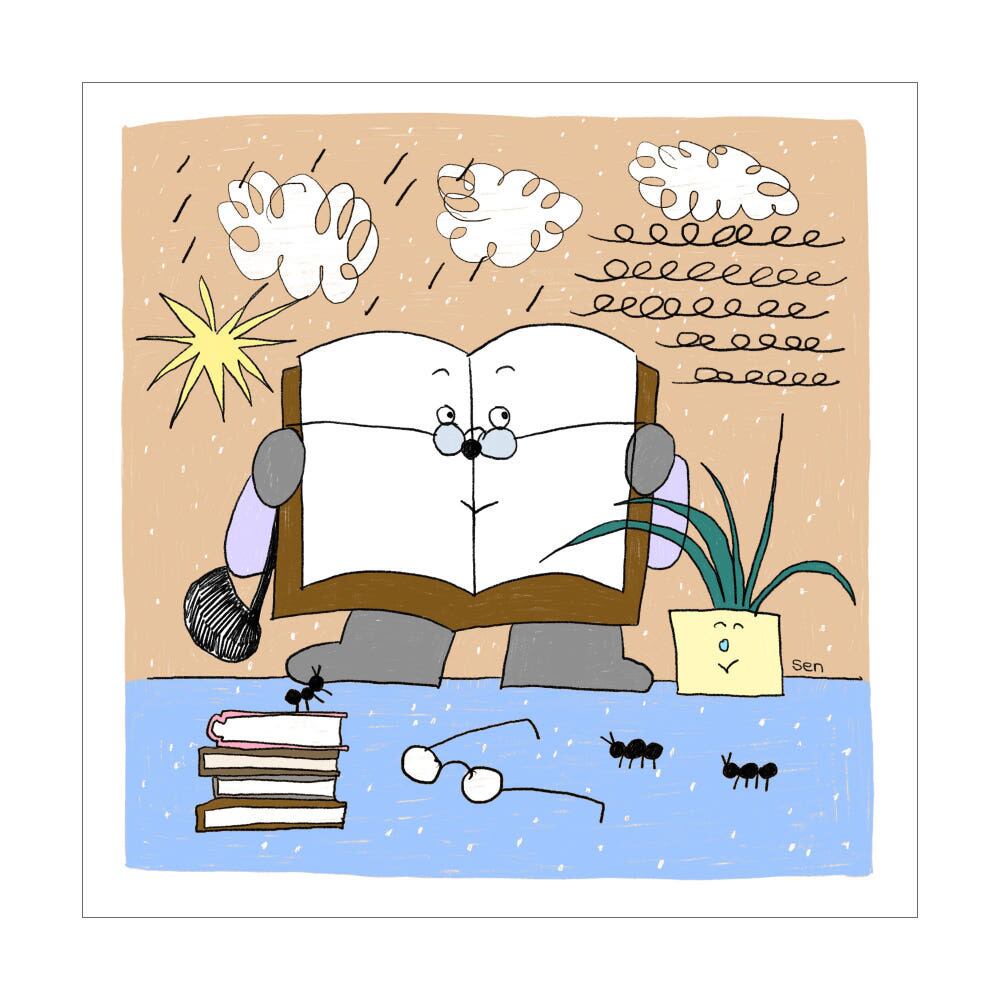 積み上げられた本や、傍らで見守る植物、そしてなぜか足元を歩くアリたち……。