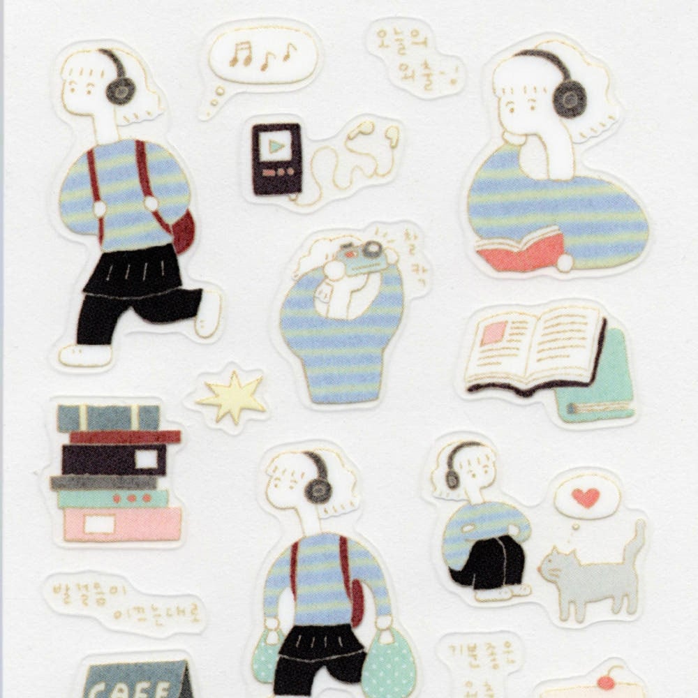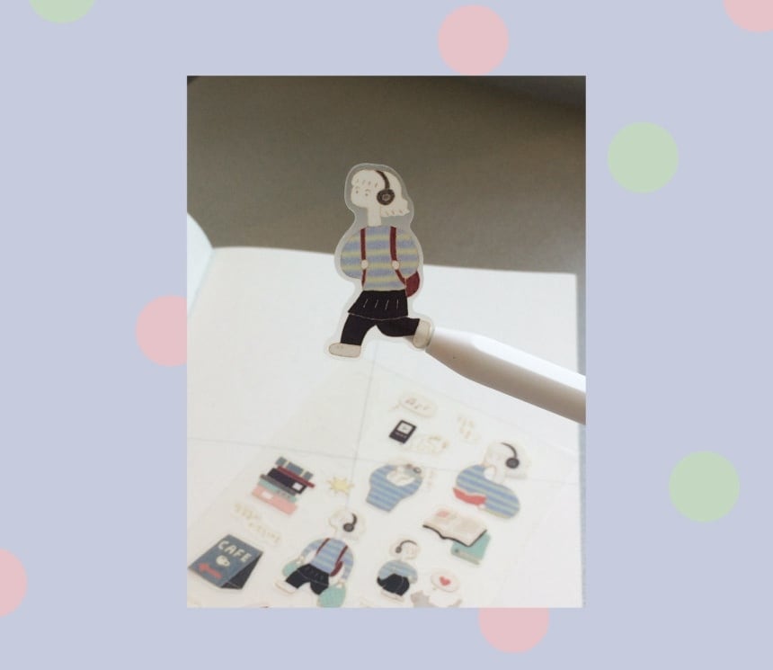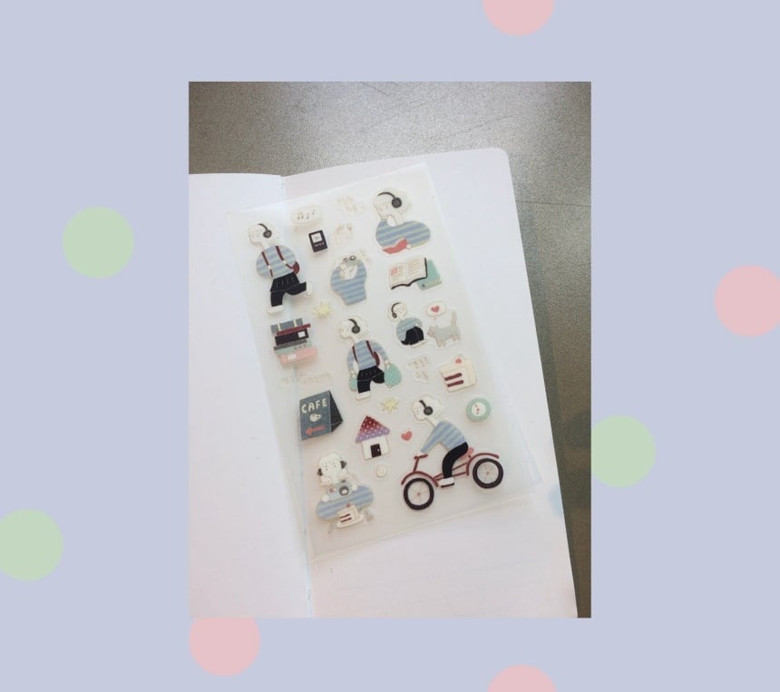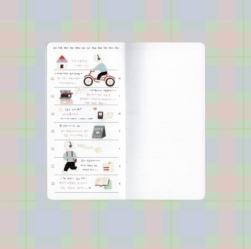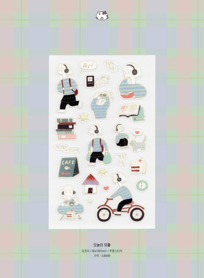 ゆるやかなタッチで描かれた女の子と、猫やケーキ、自転車といった温かみのあるモチーフたち。手帳の余白にそっと貼るだけで、その日の空気感まで一緒に残しておけるような、優しい雰囲気が魅力です。