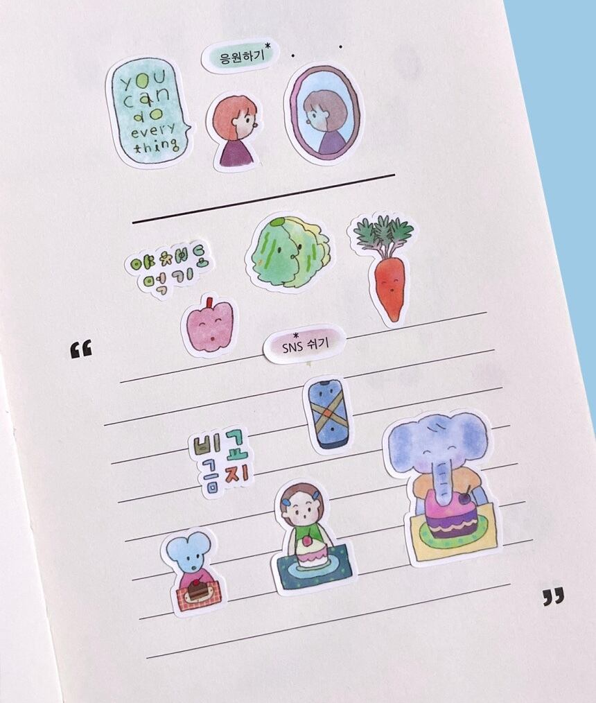 鏡に向かって自分を応援したり、ゆっくりと深呼吸をしたり、時にはデジタルデトックスをして一息ついたり。そんな「自分をいたわる瞬間」が優しい手書きイラストで表現されています。